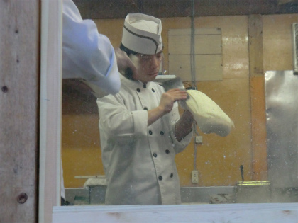 写真は麺を刃で切って、沸騰している鍋の中へ入れているところ。