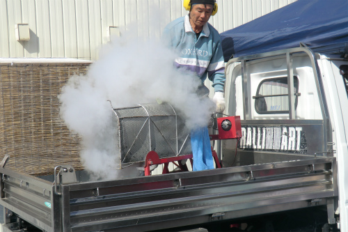 餡詰めたての日月最中を手にうっとりのリーダーのトモコさん。
