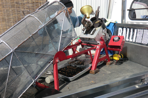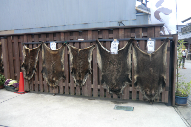 店の塀には剥いだ猪の皮が干してある。左の小さなもので50kg、右は80kgの猪。