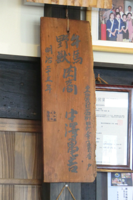 精肉店「井筒亀」に掲げられていた明治23年発行の許可証「牛馬 野獣肉商」と書いてあるのが時代を感じさせる。