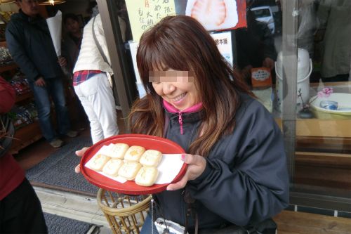 黒米が入った餅と五平餅、五平餅を購入。ボクらが来ている皮のジャケットを見て「バイク乗り?私もバイクに乗るのよ」と嬉しそうに語ってくれた。