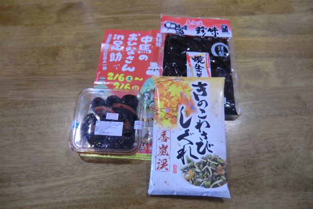 お土産は漬物、きのこのわさびしぐれ、焼き生姜の醤油漬け、プルーンの赤ワイン漬け。