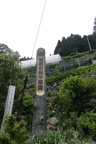 左へ折れてしばらく進むと「棚田等十選茶園」の案内板があり、廃校となっている小学校にバイクを止めて茶畑を上がる。