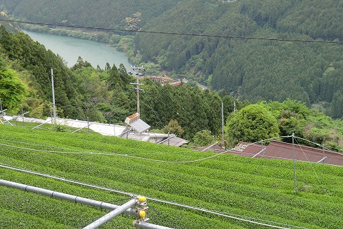 茶畑の脇を通る林道をバイクで上っていくと、先の茶畑のさらに上に茶畑があった。