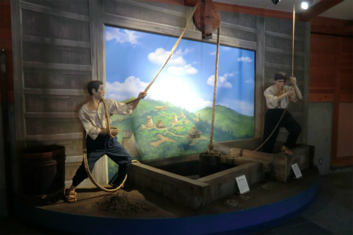 当然当時は機械化されておらず、井戸の底に入って人力で原油を汲み出すので、右の人は、たたら(踏鞴)と呼ばれた大型のふいごを踏んで空気を送る。