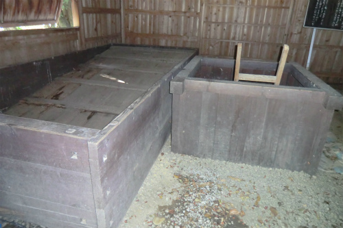 中を覗くと、復元された井戸と大型の踏鞴(たたら 左の箱)がある。