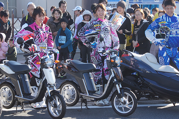 レースの先導を務めるのは、全日本モトクロス選手権レディースクラスに参戦している安原さや選手(左)と、IA2クラスに参戦している弟の安原志選手(右)