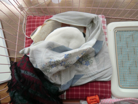 まだ寒いのか、ゲージの中では座布団袋の中に入っている。