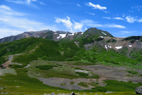 上の写真はどちらも三の池、左の写真で白くあるのは残雪。