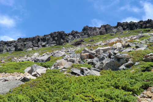 三の池の下部から上をみると、溶岩でできた張り出しが見える。