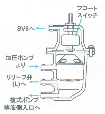 原因は脱ガスチャンバ内のフロートに穴が開き(当時はステンレス製のフロート)、フロートが沈み、SV8のスイッチがON状態になっていることが分かった。