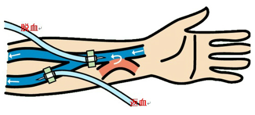 血液透析は1分間に150~300mlの血液を、ダイアライザーに流さねばならず、そのためには通常手首付近で、動脈の血管と静脈の血管をつなぎ合わせる「シャント」の手術をする。