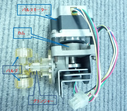 図は現在の原液注入ポンプで、当時の原液注入ポンプは、パルスモーターとカムの間にギアボックスがあった。