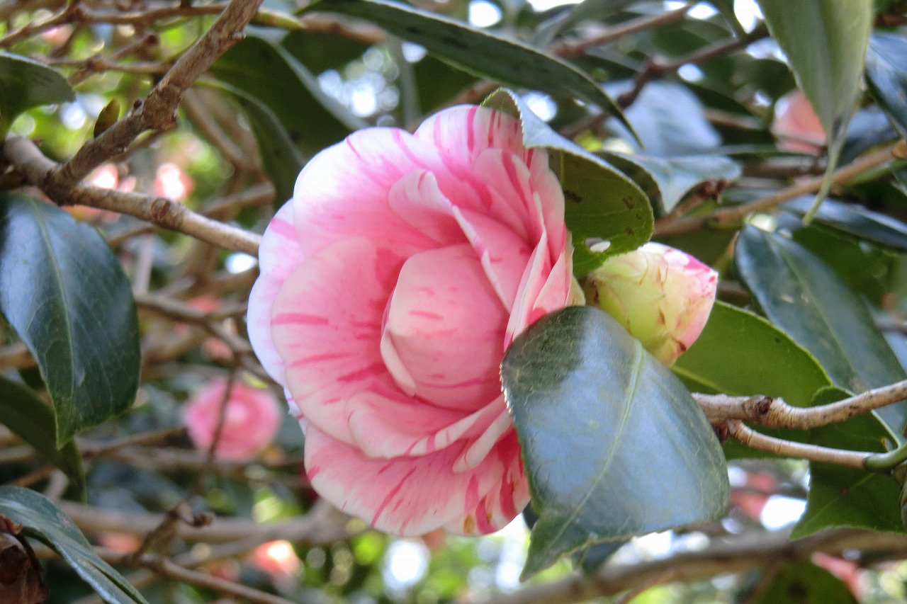 樹齢350年の五色椿(オトメツバキ)も咲いています。