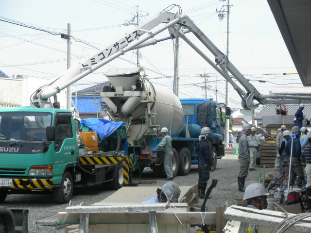 コンクリートは、コンクリートミキサー車(奥の車)からポンプ車(手前の車)に生コンが送られて、玄関に流し込まれます。