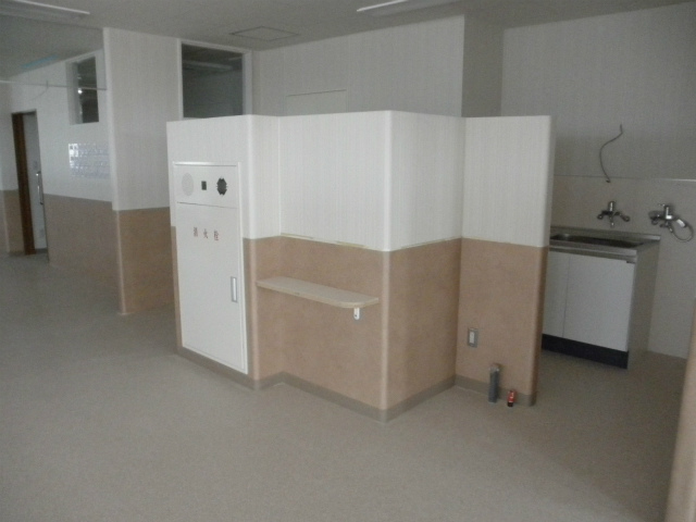 コンクリートがむき出しになっているところは、家具のカウンターが置かれ、中を透析液と透析排液のパイプが走ります。