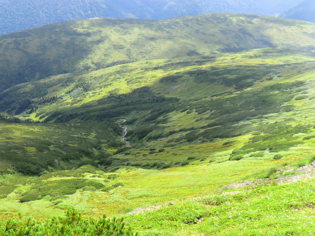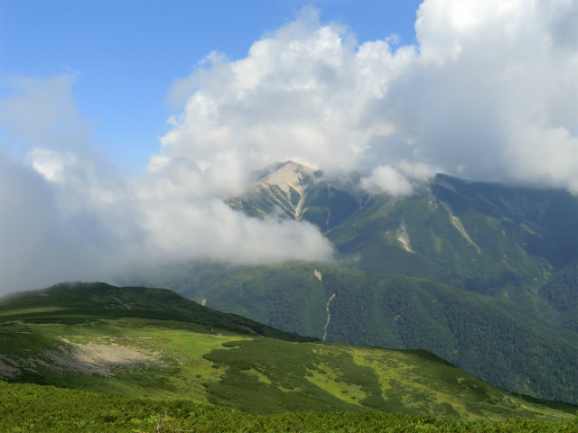 目を上に転ずれば、時折雲の切れ間に薬師岳や鷲羽岳などが見える。