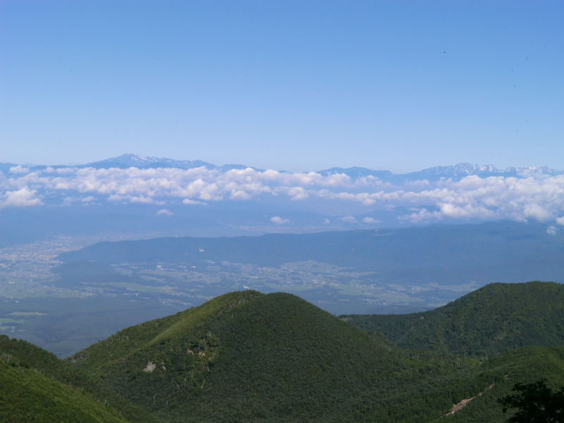 その左は穂高連峰が、さらに乗鞍、御嶽の山々が青空をバックに、雲の合間にそびえています。