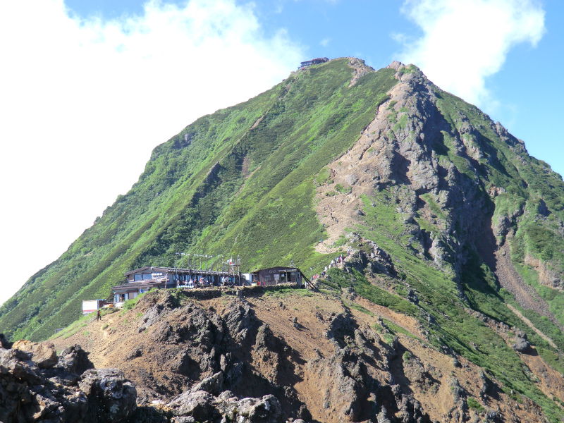 第一の目的地、横岳へのルートで、後ろを振り返ってみると、とんがった山が見えます。