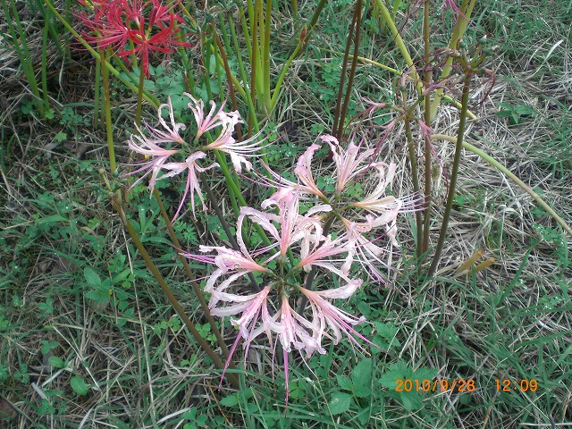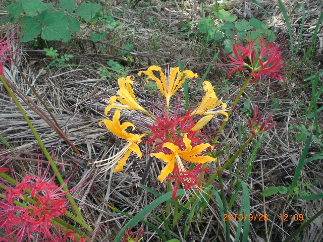 昨年9月下旬、東海北陸自動車道のハイウェイオアシス「かわしまPA」に寄ったところ、なんと黄色とピンクの彼岸花が咲いていた。