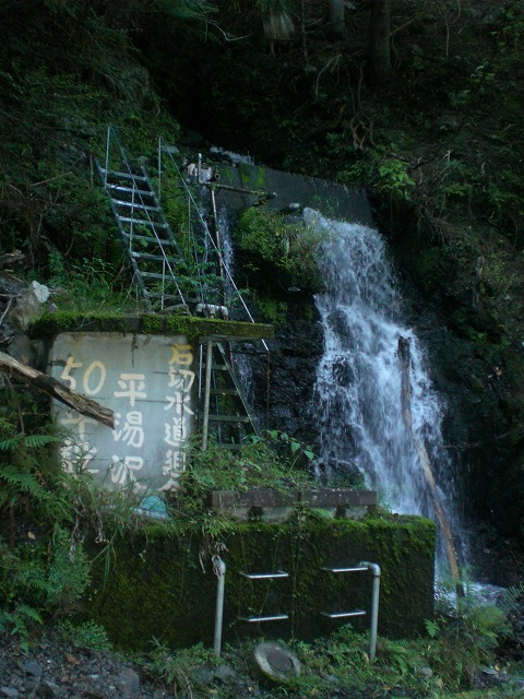 案内板には「石切水道組合 平湯沢 50年設置」とある。