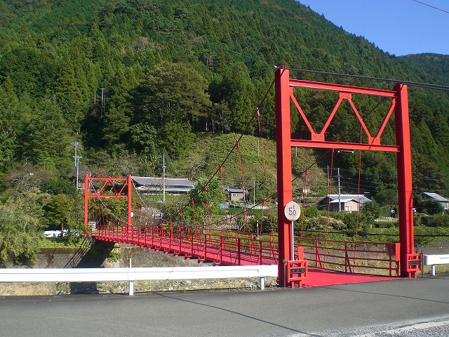勝坂神楽の里は気田川の左岸にあり、赤い吊り橋を渡る。