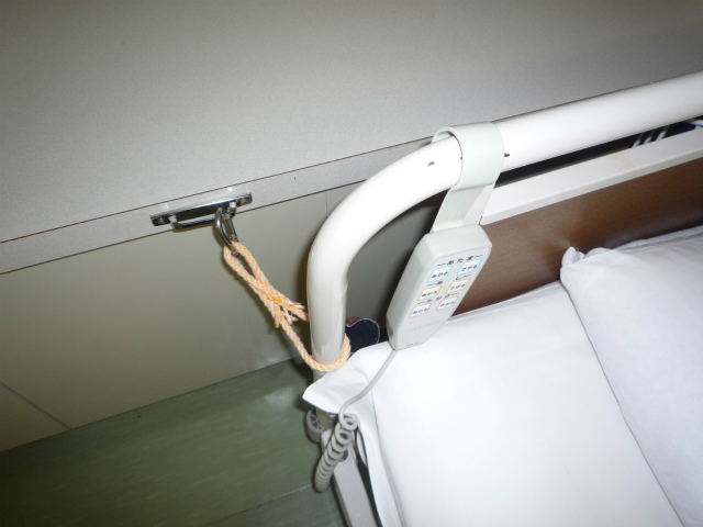 ベッドのキャスターをロックしていても、地震の揺れで動いてしまう可能性があるので、左図のようにロープでカウンターに固定しています。