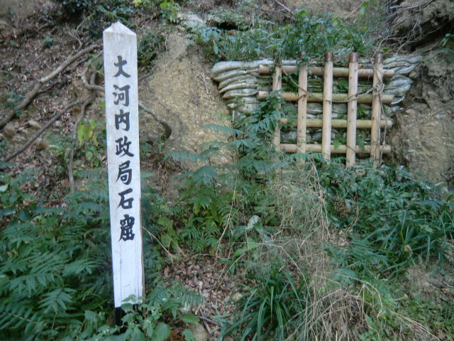大河内幽閉の石風呂(石窟) 天正2年の勝頼による攻撃で小笠原氏は開城したが、軍監大河内源三郎政局は留まり、勝頼の命に服さなかった。その為勝頼は政局を幽閉し、天正9年徳川軍によって落城するまで、この中ですごしたという。その忠節を賞し家康から恩賞が与えられたが、後に長久手の戦いで討死したと伝えられる。