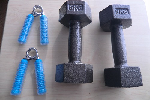 これではアカン、早速スポーツデポに行って握力30kgのハンドグリップと、5kgのダンベルを購入した。