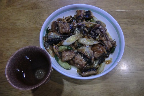 キュウリ、シメジ、ネギを入れた、揚げイワシの中華炒め。