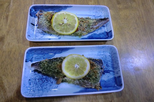 サバに塩、コショウし、おろしニンニクを塗り、パン粉とパセリの微塵切りをのせてオリーブオイルをかけてオーブンで焼けば出来上がり。