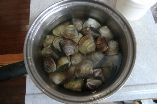 よっしゃ、チャウダーにしようと、蛤をワインで蒸して身を取り出し、野菜を炒めて小麦粉を振って・・・