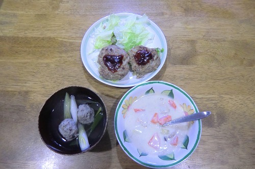 つみれ汁(和)鰯ハンバーグ(和洋折衷)チャウダー(洋)、妙な取り合わせだが、食べられたからOKとしよう。