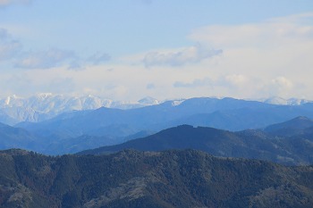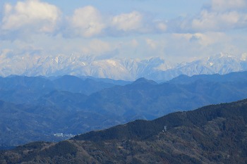 Aコースから登り、1時間もかからず山頂へ、南アルプスははっきり見えるものの残念ながら富士山は見えない。