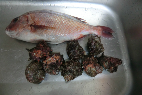マダイとサザエの刺身、マダイの大根アラ煮、ゆで卵入りのドテ煮、サザエのつぼ焼き、すべてボクが調理した。