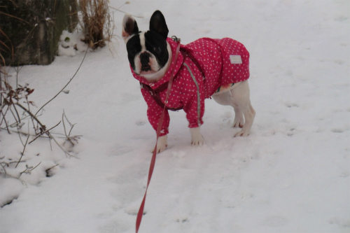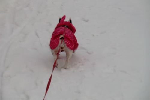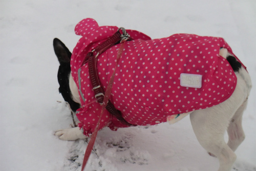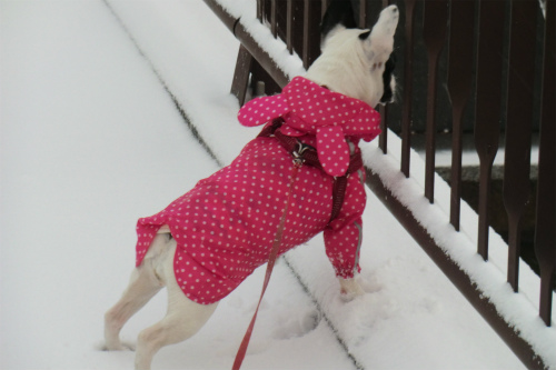 フリースの上に合羽を着せたが足は無防備、にもかかわらず積もっている雪を食べ降ってくる雪に飛びつく。