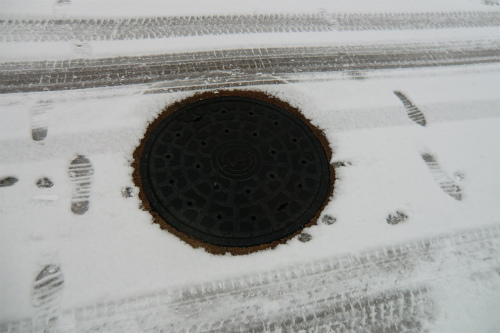 マンホールだけは温かい下水が流れているので雪が融けている。