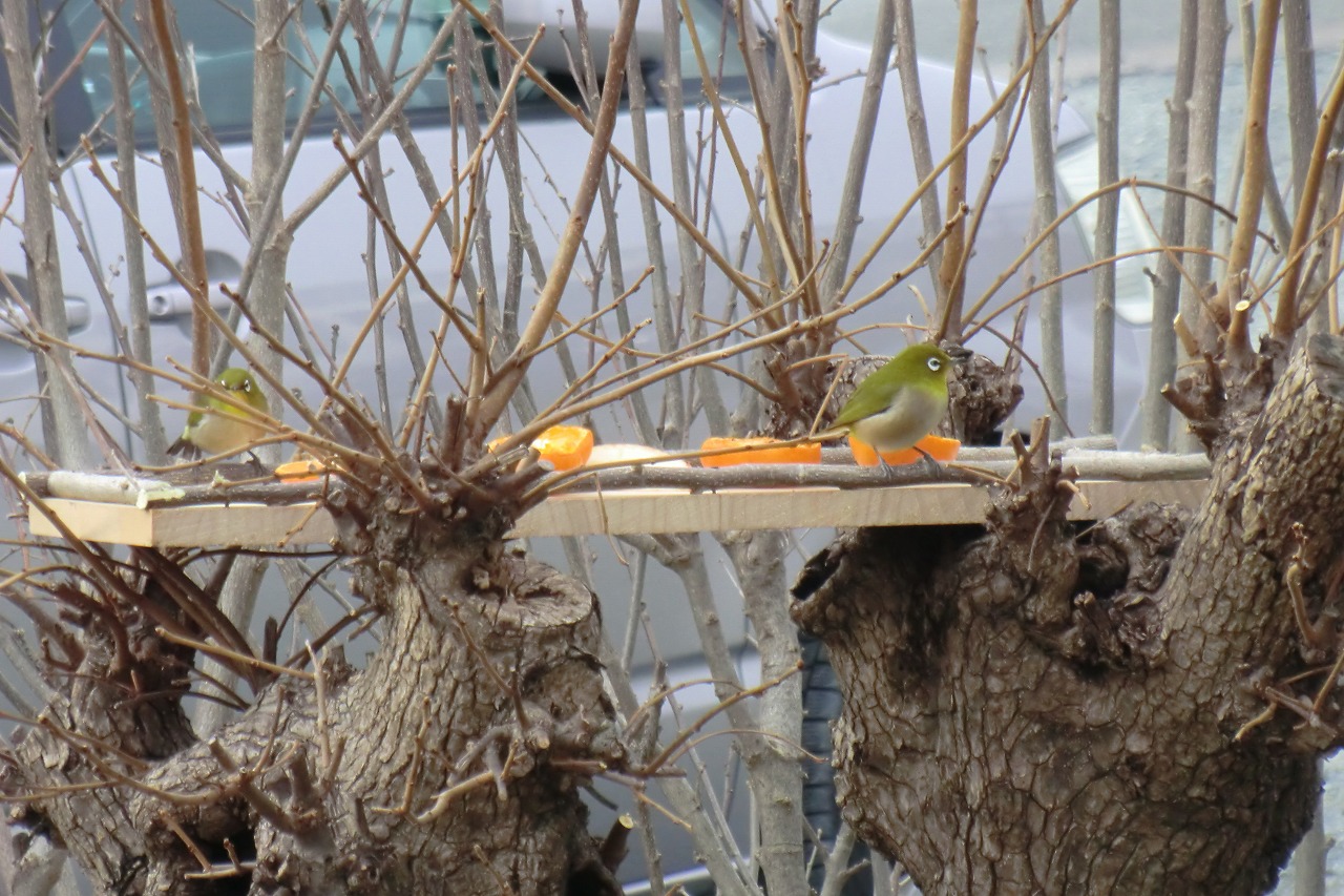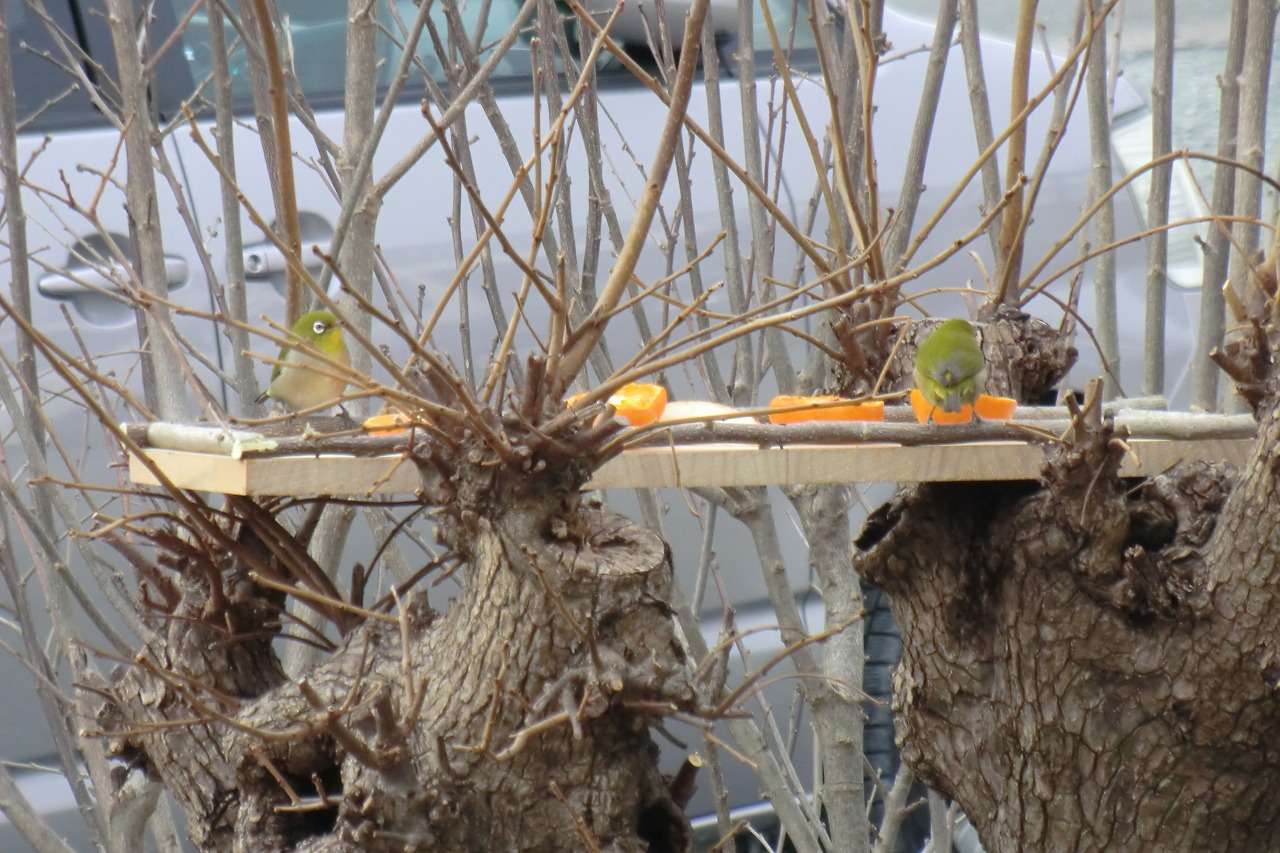 我が家のメジロといっても飼育しているわけではなく、庭にエサ台を設置してミカンやリンゴなどの果物を置いたところ、ツガイと思われるメジロが来るようになった。