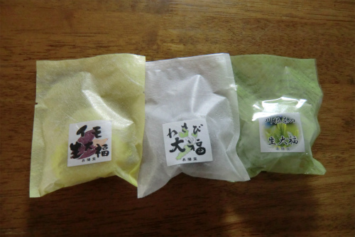 帰路、川根町地名にある昇陽堂に寄り、わさび大福、イモ大福、生大福を購入。