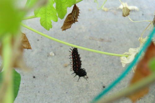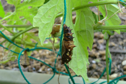 カミさんが緑のカーテンにと植えたニガウリの棚には、この幼虫のサナギがぶら下がっている。