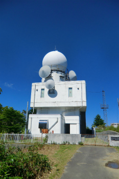 雨量レーダー計、アンテナから発射した電波は、雨に当たり反射波としてかえってき、その強弱で雨量を測定する。