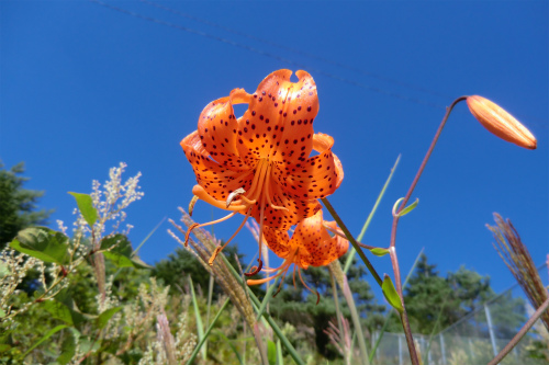 青空の下、オレンジのクルマユリが映える。