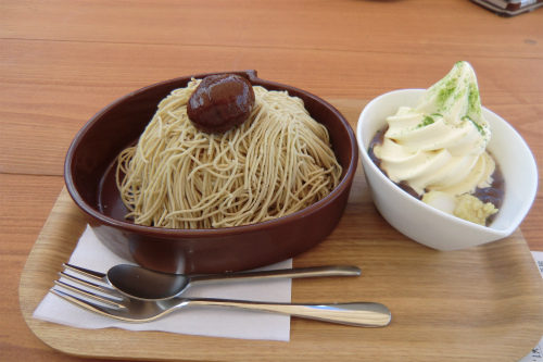 ボクが注文したのは、洋菓子のモンブランに乗せてある栗のそうめんみたいなやつ+アイスぜんざい。