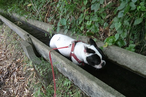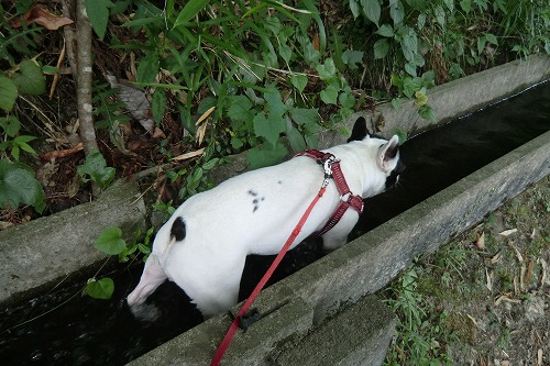ちょうど水路が流れていたのでオミソをいれてやると、気持ちよさそうに水路につかる。