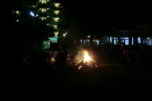 たき火で暖をとっているのは少年剣士たち、これから朝稽古が始まる。