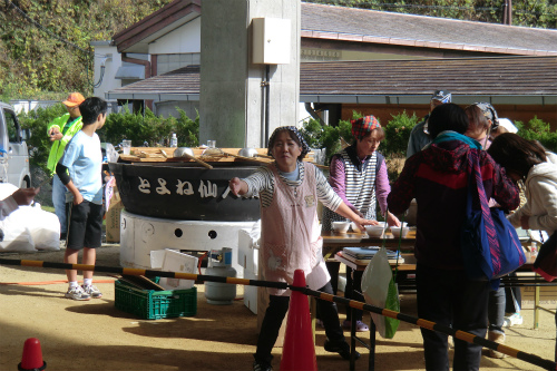 「とよね仙人鍋」と刻印された、2000人分調理可能な大鍋で仕込んだキノコ汁は絶品。