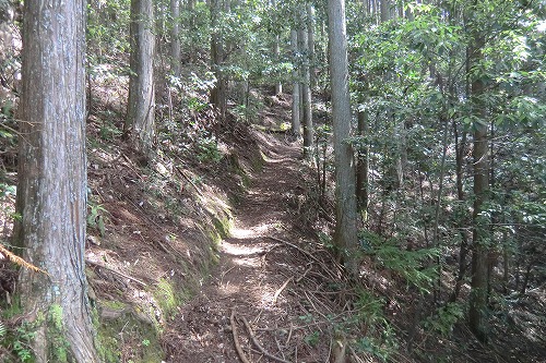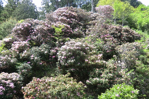 吉沢の人家が見えてきたところにホソバシャクナゲが満開。写真を撮りながら後ろを振り向くと、目当ての大杉が目に入った。