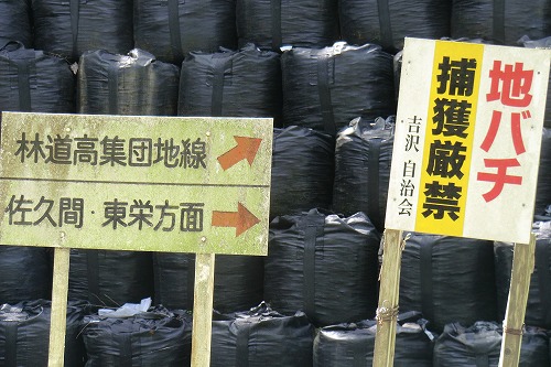 「吉沢の大杉」を目指してバイクを進めると、「地バチ捕獲厳禁」の看板が3つほどたっていた。