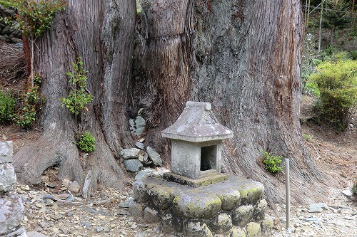 大杉の隣に住む、80歳代と思われる人が出てきて「今は1本の木のように見えるが、ワシが子供の頃は手前の祠が、2本の杉の間に入っていた」そうだ。