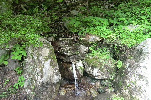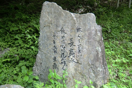 林道を進むと「飲んでください長寿水 飲めば心に花が咲く」の石碑があり、清水が湧き出ている。
